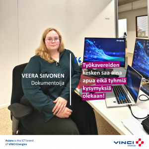Axiansilla, nykyään dokumentointia tekevä, Veera on työskennellyt reilu kaksi vuotta. Hän aloitti uransa työharjoittelulla tehden monipuolisesti avustavia suunnittelun tehtäviä opiskellessaan vielä rakennusinsinööriksi. Hän teki myös opinnäytetyönsä Axiansille erään järjestelmän ohjeistukseen ja käyttöön liittyen.