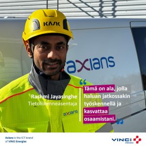 Rashmi Jaysinghe on 36-vuotias tietoliikenneasentaja Axiansilla ja hän työskentelee pääasiassa Etelä-Suomen alueella. Rashmi on työskennellyt Axiansilla lähes kaksi vuotta ja hänen työtehtäviin kuuluu muun muassa teletyöt jakokaapeilla, jatkoksilla sekä laitetiloissa. Usein Rashmi vastaa tietystä alueesta tai projektista, jossa työt suoritetaan, testataan toimivuuden varmistamiseksi ja luovutetaan sitten työnjohdolle. Tyypillisesti useita projekteja on käynnissä samanaikaisesti ja tehtävät aikataulutetaan joko itsenäisesti tai yhteistyössä työnjohdon kanssa. Rashmi arvostaa työn liikkuvuutta ja monipuolisuutta, sillä työ ei rajoitu yhteen paikkaan, vaan tapahtuu eri kohteissa.