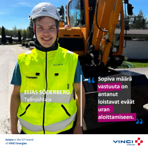 Elias Söderberg on 24-vuotias opintojensa loppusuoralla oleva Axiansilainen. Elias on toiminut työnjohtajana eri alueilla Vihdissä, Nokialla ja nyt Raision alueella.